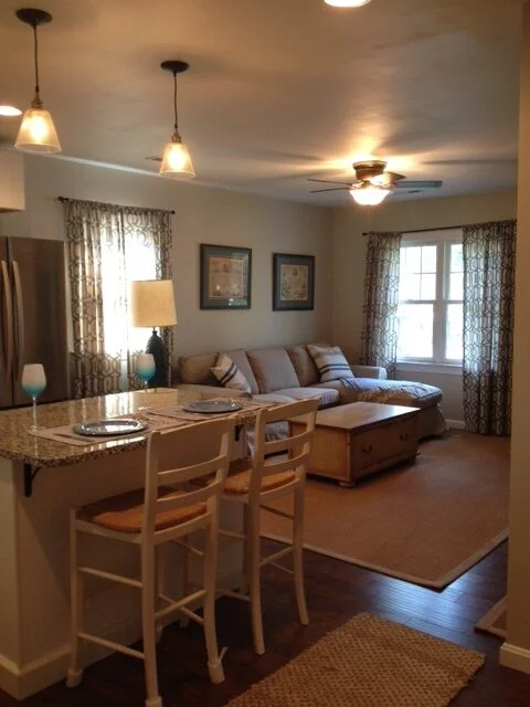 The bathroom remodel was equally important due to the fact the beach cottage had one full bath and a second bathroom was not in the budget. A double-sink vanity was a must so guests and owner each have their own area. The design was elevated with a marble countertop, undermount sinks and stylish sconces. The classic gray and white color palette offered both timeless design and coastal vibes.
